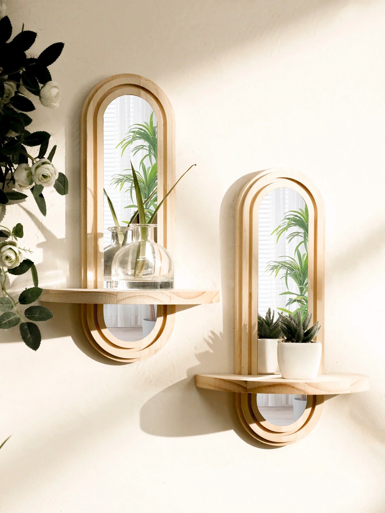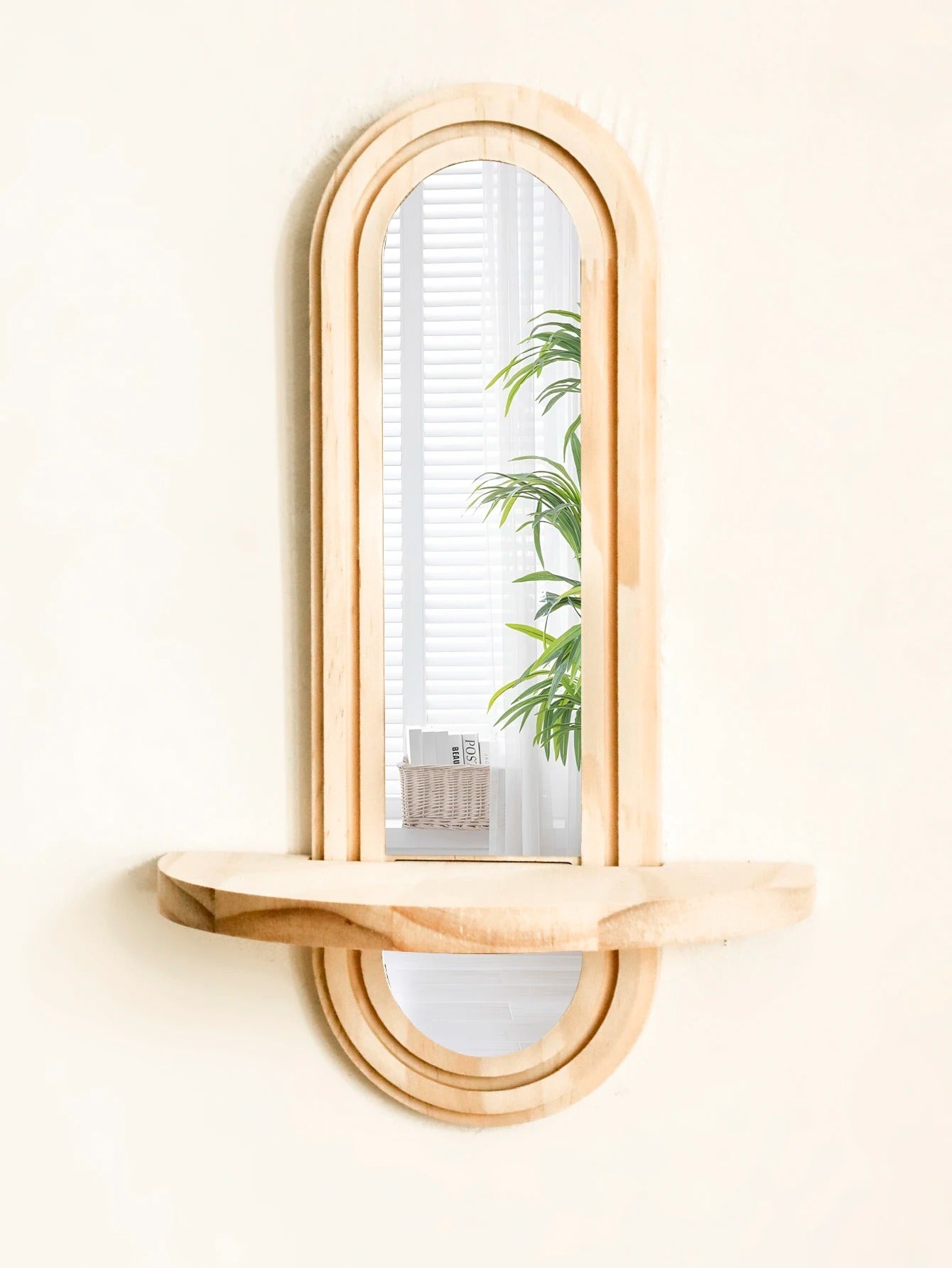 מדף קיר מעץ טבעי בשילוב מראה מעוצבת בסגנון בוהו, שמוסיף חמימות וסטייל לכל חלל. מושלם לארגון דקורטיבי ולהצגת עציצים, נרות, אביזרי נוי וחפצים קטנים – בחדר שינה, סלון או כל פינה בבית.