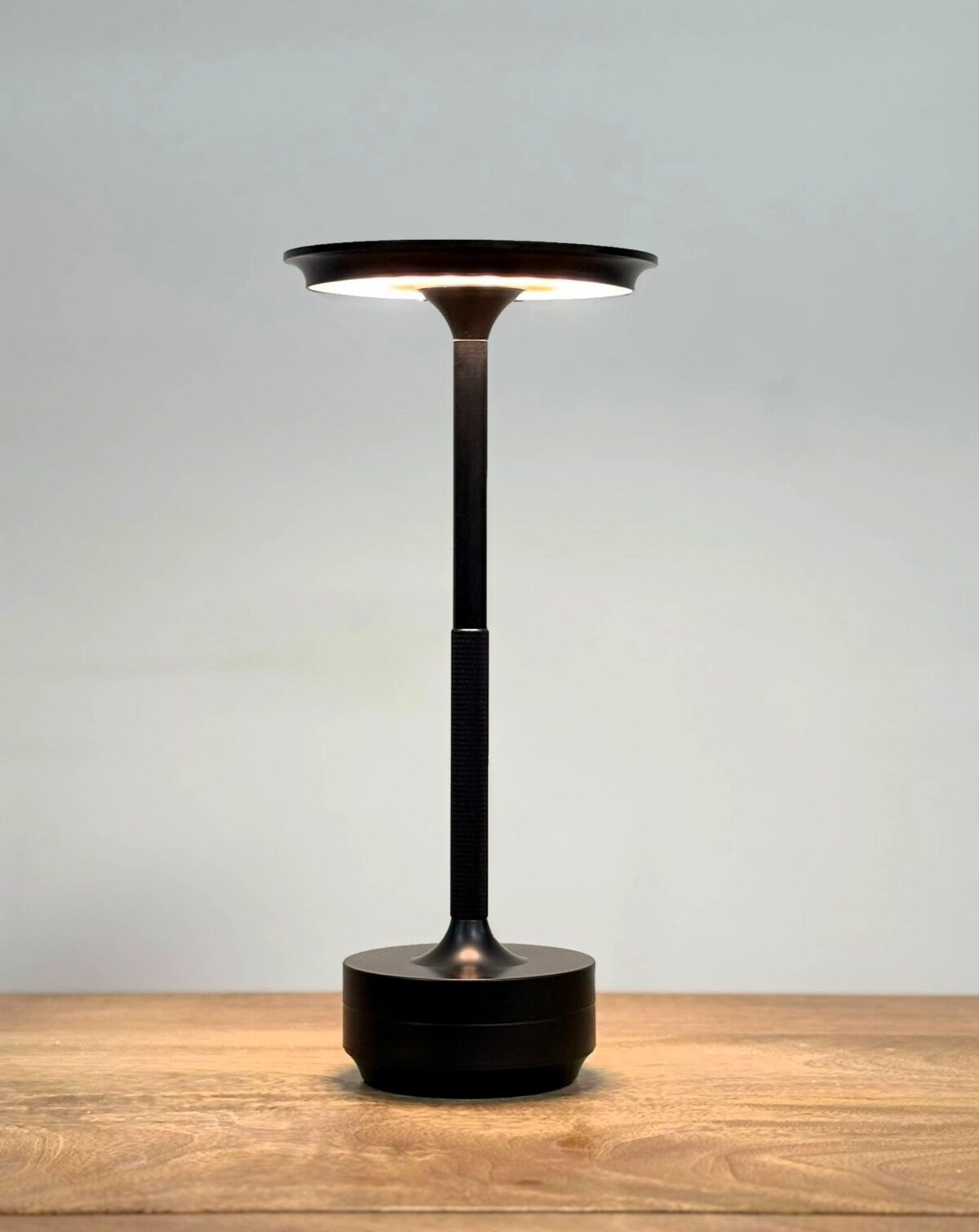 מנורת שולחן מודרנית בעיצוב מינימליסטי, בעלת גוף מתכת שחור בגימור מט. המנורה כוללת בסיס עגול יציב וראש תאורה שטוח המפיץ אור רך ונעים כלפי מטה. היא עשויה מחומרים איכותיים, מתאימה לשולחן עבודה, חדר שינה או כל חלל שזקוק לתאורה נקייה ואלגנטית, ומוסיפה מראה עכשווי לכל סגנון עיצוב.